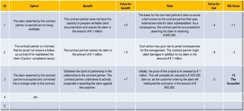- If all identified options have been evaluated and compared in such a structured manner by the team, the choice of that course of action („Option“) with the highest RB-Value appears to be the most effective.